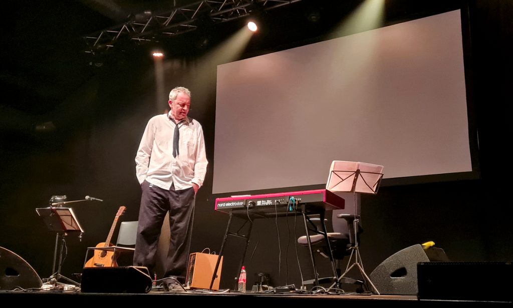 Es ging weiter mit Lonely planet, das so ruhig und schön wie schon immer war. Im Publikum war es andächtig still. Wer Rainald von früheren Live-Programmen kannte, erlebte ihn an diesem Abend nicht so quirlig, sprudelnd und explodierend wie damals. Aber auch die ruhigere Version war stark, die Rainald-Essenz war weiterhin da. Es war faszinierend. Er war durchgehend im Mittelpunkt und hielt das Publikum problemlos bei sich. Alle hörten zu, guckten, reagierten auf ihn. Er war präsent. Nicht so ungestüm wie früher, aber die spürbare Zerbrechlichkeit machte den Abend eher noch intensiver.
