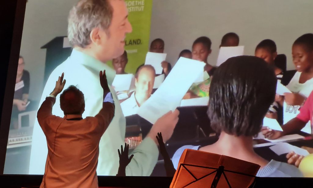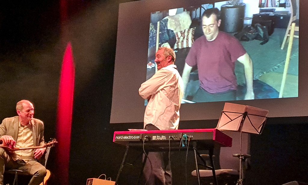 Die nächste Zeile wurde um mich herum von vielen Besuchern schon leise mitgesungen. „Es gibt Länder, wo rrrrichtig was los ist. Und es giiiiibt …“ Dann kam, freudig vom Publikum mitgesungen: „Brandenbuuurg“. In der Wiederholung sang Rainald: „Thüringeeeen“, und die Freude im Saal war wieder groß. Rainald war zurück! Der brach ab und erinnerte sich an sein Leben vor den Schlaganfällen: „Ich war Erfinder von Akkorden und Texten“. Außerdem habe er an der Elfenbeinküste gesungen, fiel ihm ein. Zum Beweis gab es einen kurzen Videoeinspieler, bei dem er mit einem afrikanischen Mädchenchor den Helene-Fischer-Hit „Atemlos“ sang. Der echte Rainald wedelte dirigierend vor der Leinwand, während das Publikum vergnügt lachte.