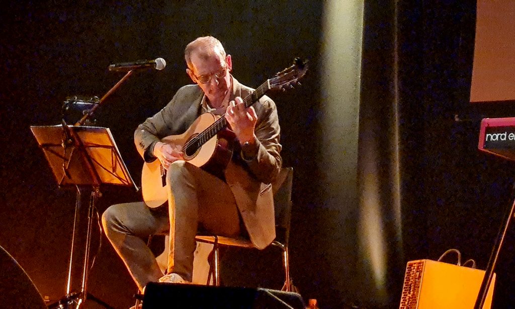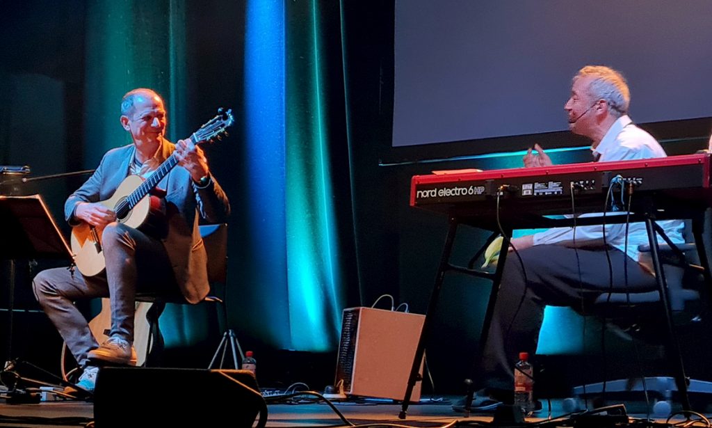 Das psychologische Jahrhundert ist vorbei wurde wieder nur von Marcus auf der Gitarre begleitet. Der spielte sehr abwechslungsreich und das Keyboard fehlte überhaupt nicht. Mehr und mehr sang Rainald sich ein und seine Stimme wurde sicherer, kräftiger und wärmer. Nach dem etwas ungeölten Beginn, bei dem er sich vor allem auf Ablauf, Texte und Aussprache konzentriert hatte, liefen sich Hirn und Stimme jetzt frei. Er konnte loslassen und wurde merklich lockerer. Immer mehr vom vertrauten, souveränen Bühnen-Rainald kam zurück.