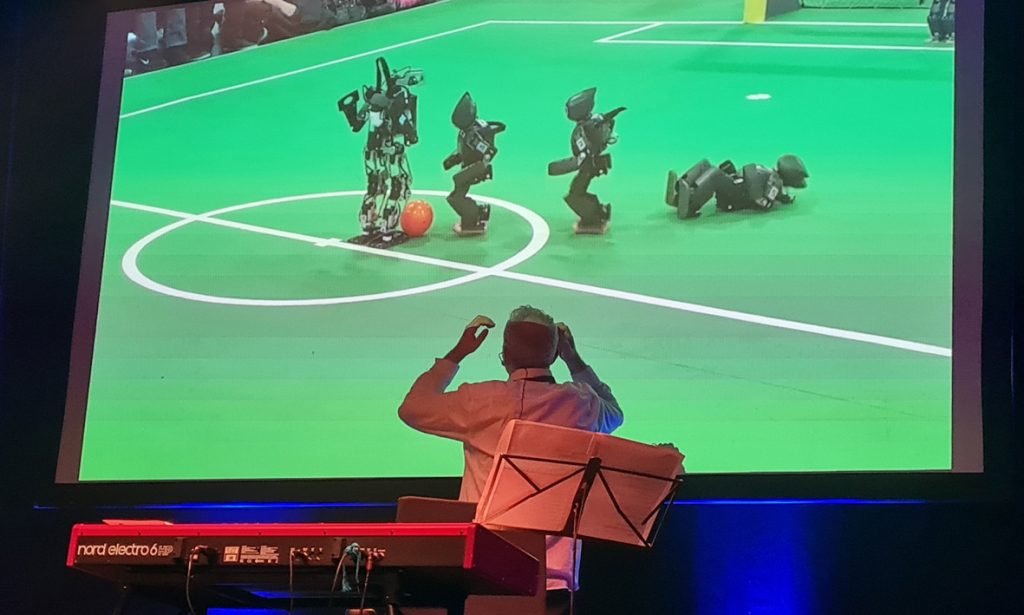 Im Gelächter des sehr vergnügten Publikums startete das nächste Video, in dem programmierte Roboter autonom Fußball spielten. Unbeholfen trippelten die humanoiden Roboter auf den Ball zu, verfehlten ihn, fielen hin, und während Rainald vor der Leinwand temperamentvoll und anfeuernd kommentierte: „Jetzt, jetzt! Schieß doch mal!“, „Nun schieß doch!!“, quietschte das Publikum vor Vergnügen.