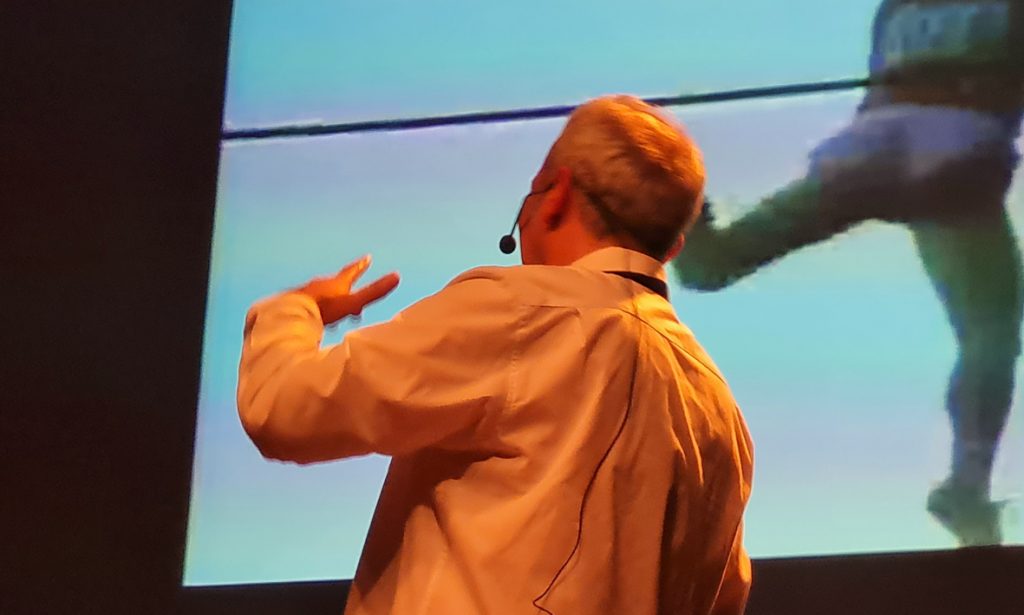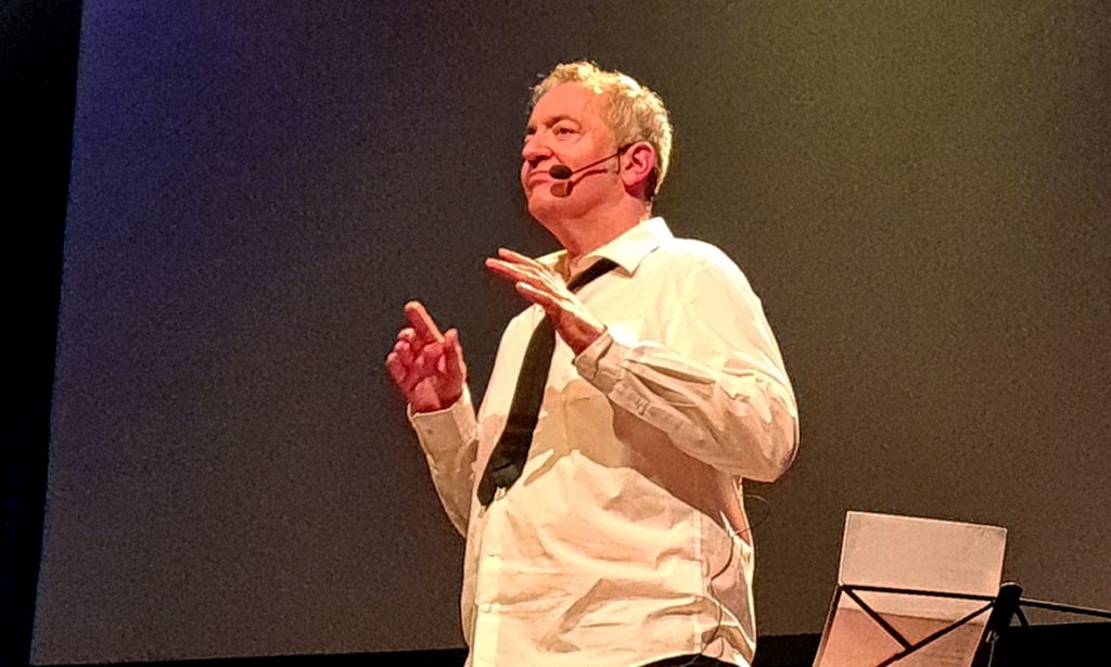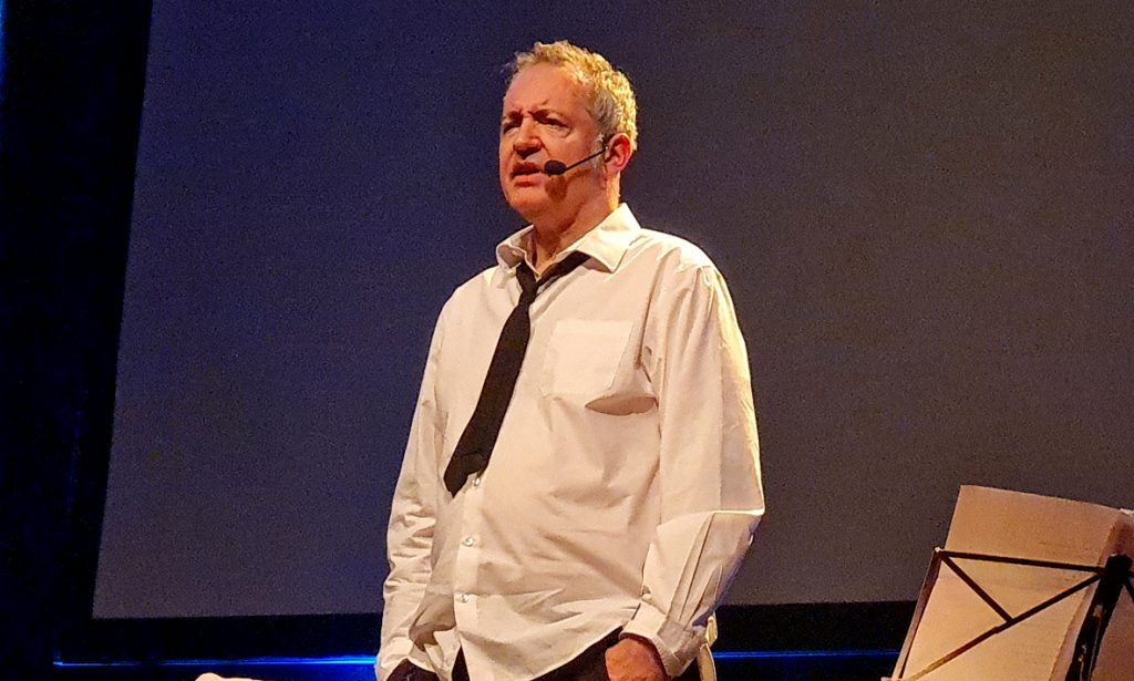 Nicht nur das Publikum, auch Rainald selber amüsierte sich über ein kurzes Video, das ihn bei einem Versuch zeigte, unter einer niedrigen Limbostange – nicht zu tanzen, sondern überhaupt durchzukommen. Es war nicht so, dass er das in jungen Jahren geschafft hätte.