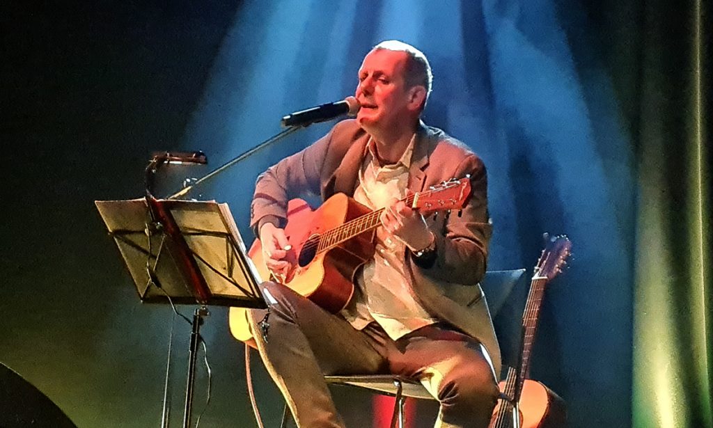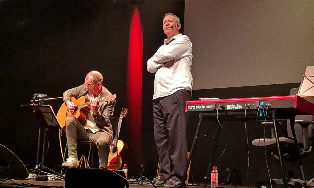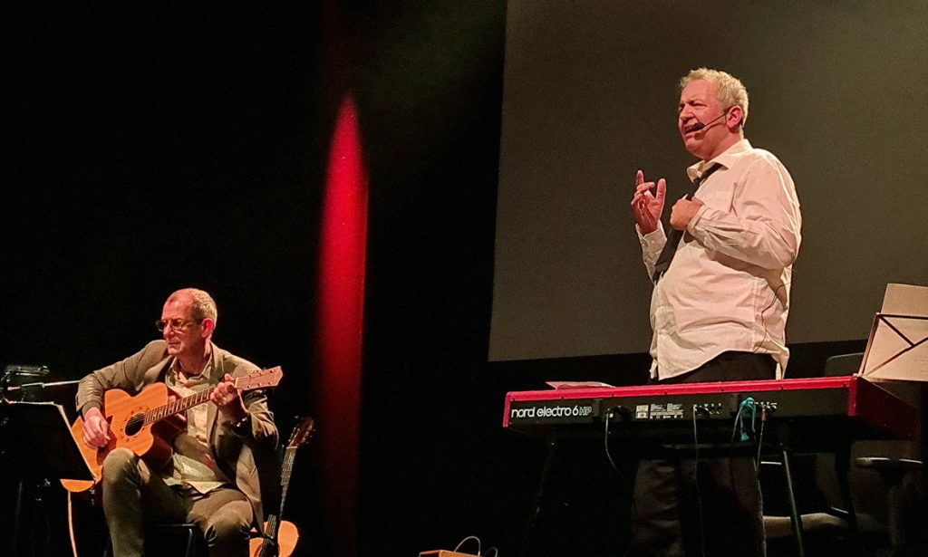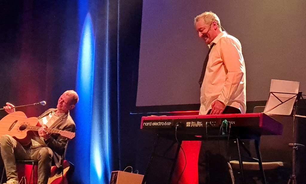 Wieder sang Rainald und wurde nur von der Gitarre begleitet. Die Keyboardklänge vermisste ich weiterhin überhaupt nicht, mir fiel tatsächlich nur optisch auf, dass Rainald nicht auf den Tasten spielte. Auch das war eine Entlastung für ihn, denn so konnte er sich nur auf den Text und das Singen konzentrieren. Alles, was er früher locker durcheinander und gleichzeitig gemacht hatte – Ansage, kleine Bemerkung, ins Publikum gucken, grinsen, fünf Schritte bis zum Keyboard laufen, hinsetzen, Akkorde spielen, Melodie singen, Text abrufen, mit dem Publikum interagieren – war für ihn nach den Schlaganfällen nun eine Menge von Einzeltätigkeiten, die bewusst gemacht werden mussten. Aber es funktionierte, die alten Lieder saßen und die Texte wirkten immer noch. Rainald war der Showmaster, das Publikum lachte auf, sang Refrains leise mit und freute sich über die musikalische Reise in frühere Programme, quer durch die Zeit.
